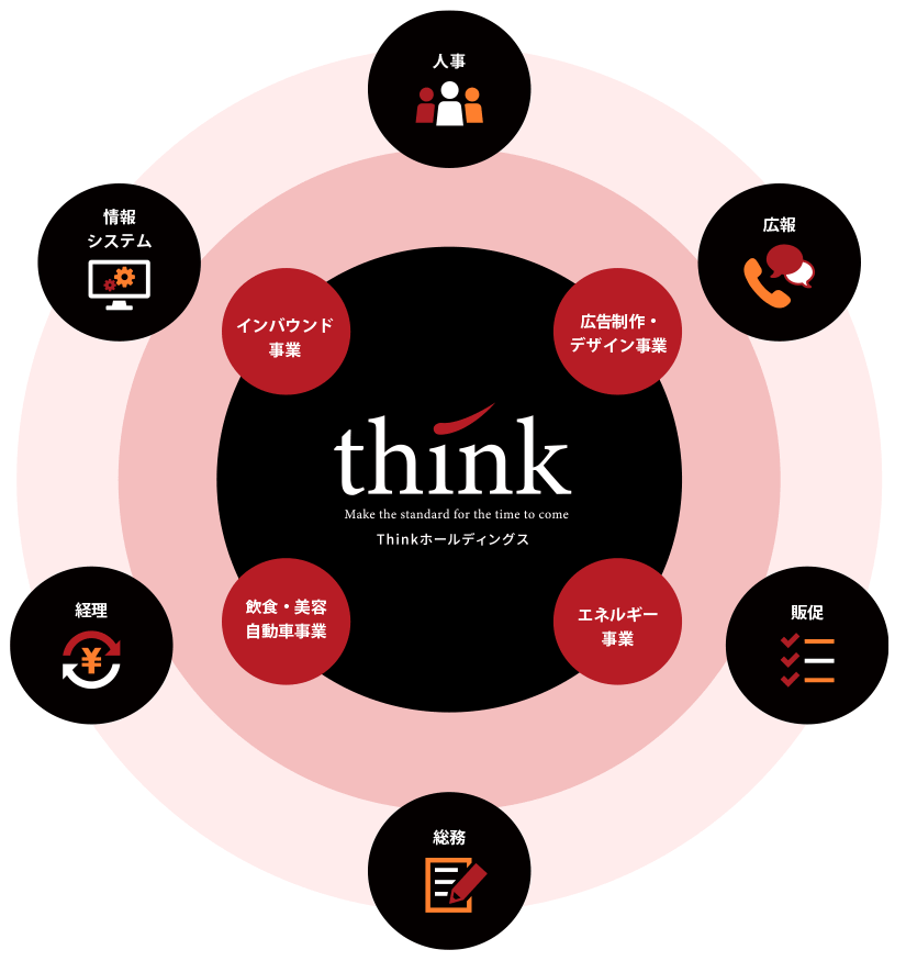 Think 株式会社は、当社を中心に広告・デザイン制作事業、インバウンド事業、飲食事業、自動車事業、美容事業、エネルギー事業から構成されたグループを、統括管理、経営戦略立案、コンサルティングするホールディング・カンパニーです。グループの幅広い事業領域とネットワークを活かし、顧客満足から顧客感動主義へ、価値のあるサービスの提供を目指して取り組んでいます。